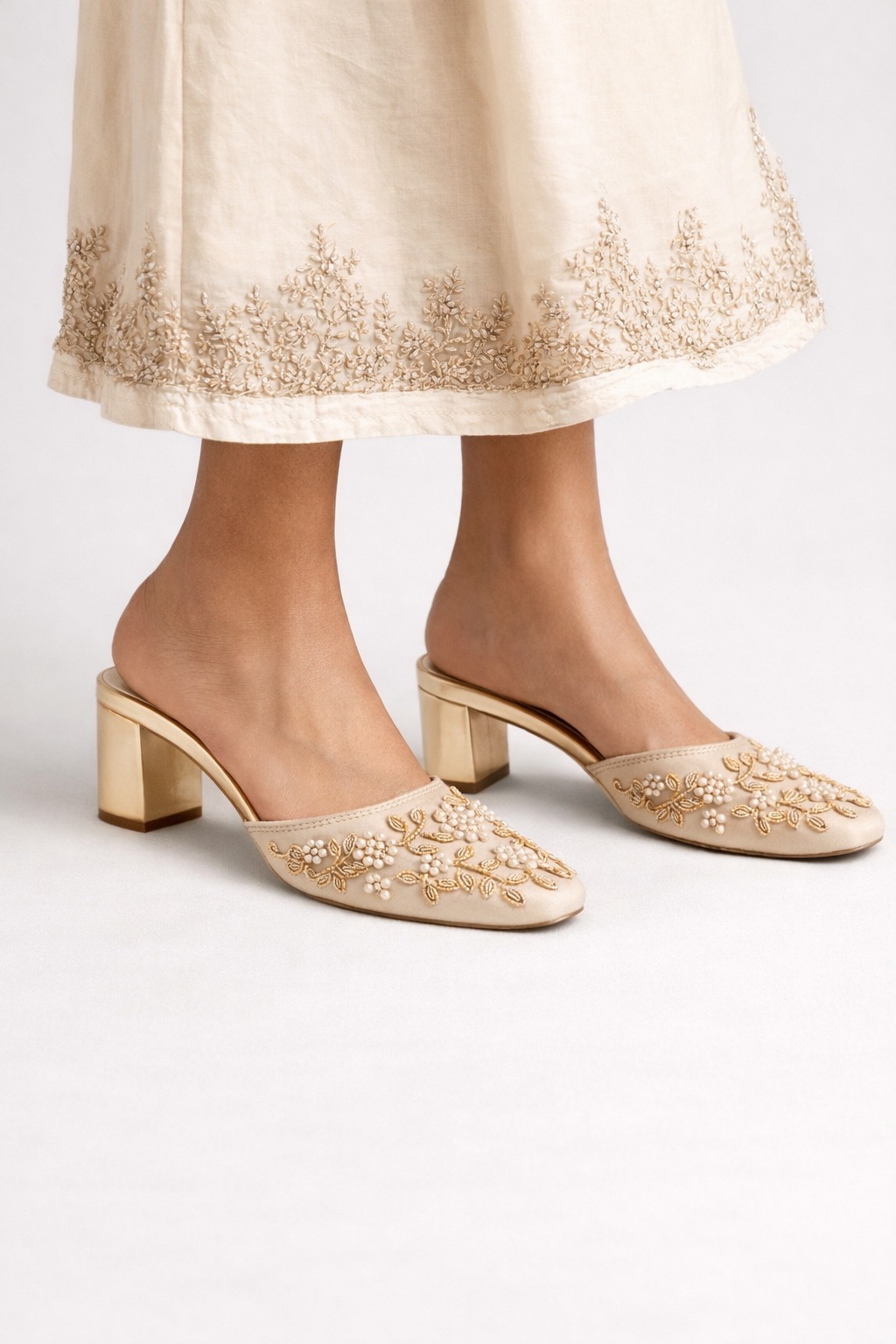 The ivory satin base is enriched with soft champagne and golden undertones, creating a luminous depth that catches the light. These warm, refined tones complement a wide range of light and neutral outfits, making them a perfect choice for brides, bridesmaids, and special occasions where understated luxury is key.